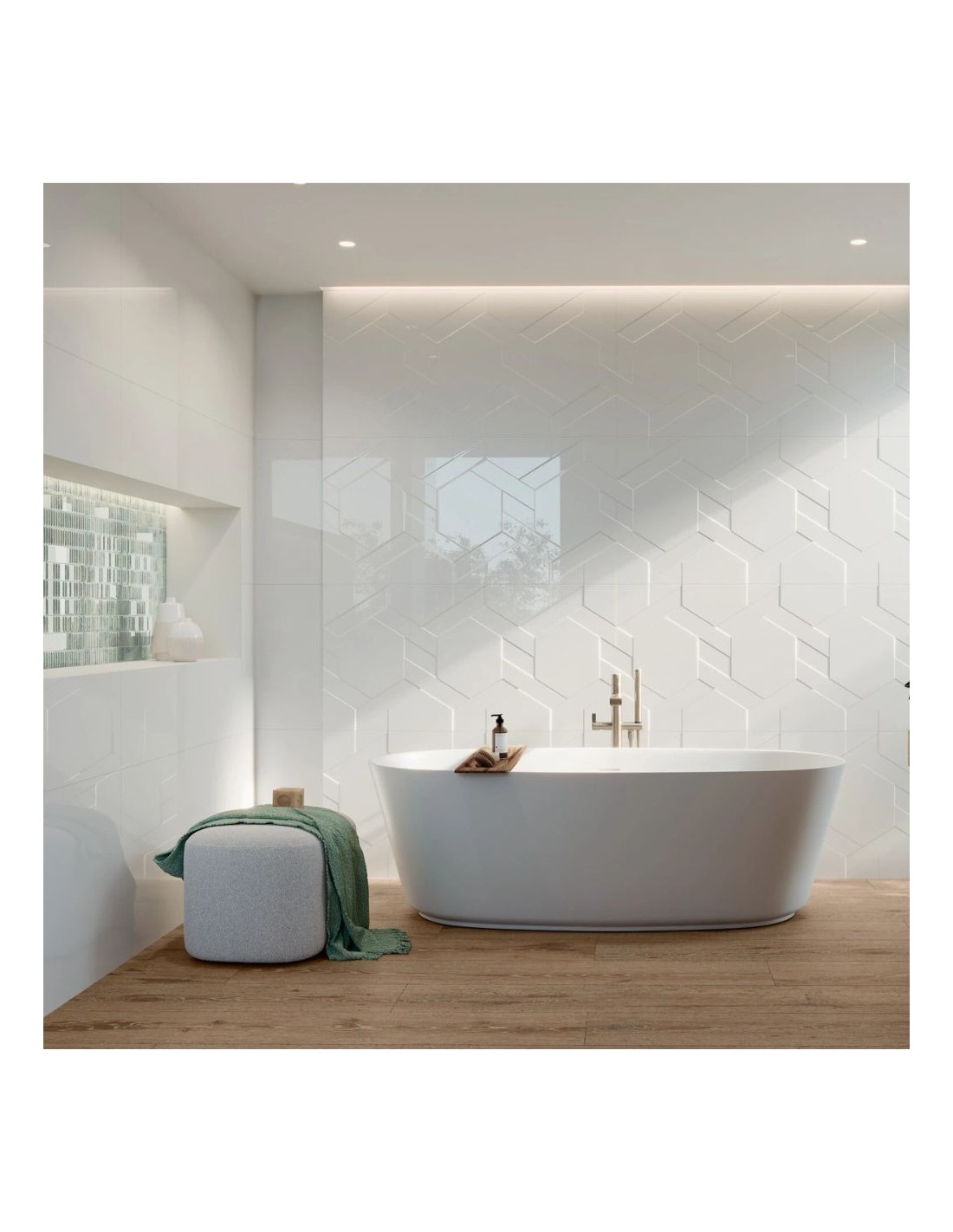 Gracias a su base blanca brillo y a su baja variación cromática, esta pieza funciona como lienzo neutro para combinaciones sobrias o atrevidas, y se coordina a la perfección con los relieves y decorados propios de la colección Islandia. Su formato longitudinal potencia la sensación de amplitud en paredes continuas y paños altos.