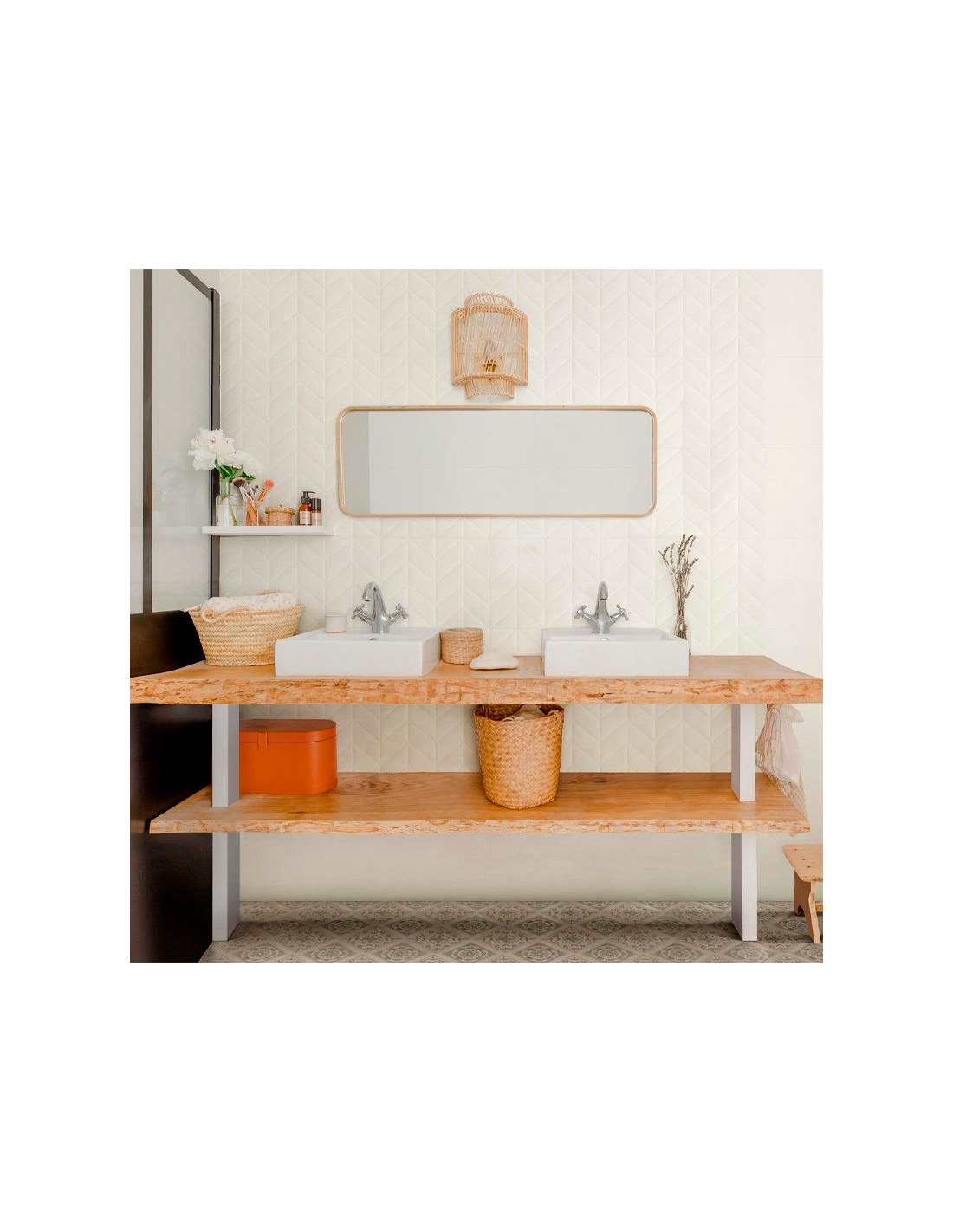 Fabricado en pasta blanca, con acabado mate y bordes rectificados, es una excelente opción para revestimientos interiores en baños, salones u otras zonas decorativas. Su formato de 30x90 cm se adapta a composiciones modernas, especialmente cuando se combina con piezas lisas o con otras texturas de nuestra gama de azulejos de colores.