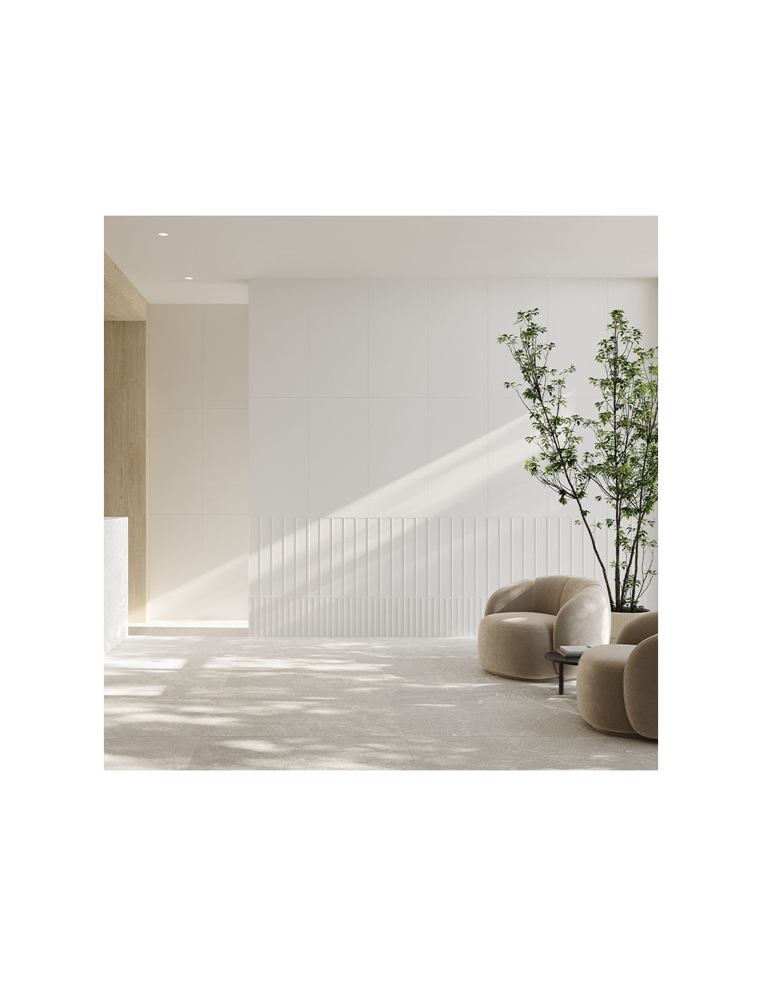 Fabricado en cerámica de pasta blanca y con un elegante acabado mate, este revestimiento en gran formato 60x120cm ofrece una estética sofisticada con superficies continuas y limpias. Gracias a su corte rectificado, permite una instalación con junta mínima recomendada de solo 1,5 mm, logrando un resultado visual más uniforme y profesional. Con un espesor de 8 mm, es fácil de manejar y apto para revestir todo tipo de paramentos interiores.