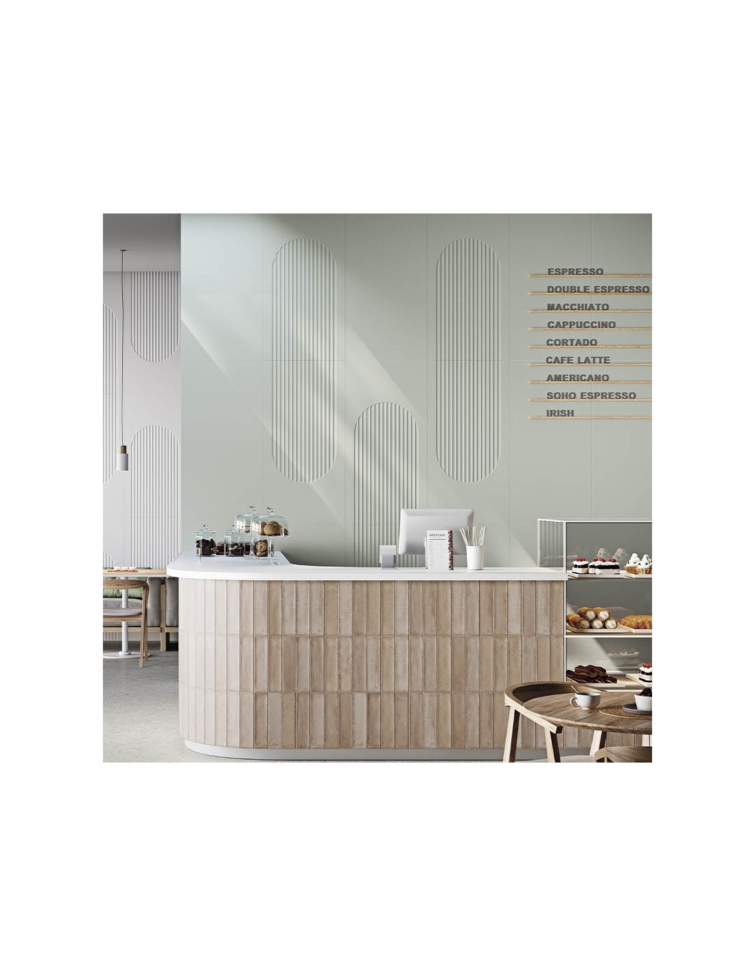 El azulejo SIROS Kos Menta 60x120cm de Grespania destaca por su frescura y modernidad, combinando una tonalidad verde menta suave con un relieve decorativo que aporta dinamismo y profundidad. Su acabado mate y diseño en relieve en líneas rectas dentro de un marco oval hacen de este azulejo una opción sofisticada y original.