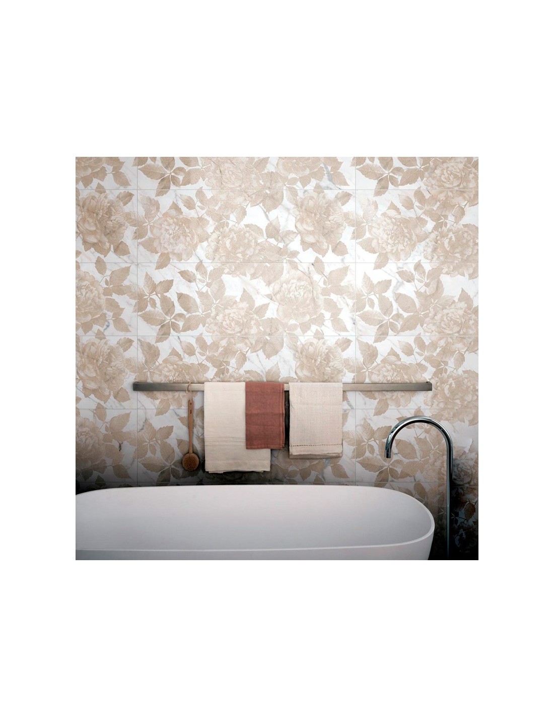 El Azulejo ALLMARBLE WALL Decoro Rose Golden White de MARAZZI fusiona la belleza natural del mármol blanco con vetas doradas y un delicado motivo floral en suaves tonos rosados. El contraste entre las vetas doradas y las flores aporta un toque lujoso y sofisticado, perfecto para ambientes que buscan destacar con elegancia. Fabricado en formato 40x120 cm, acabado mate y corte rectificado, se instala con gran precisión para un acabado impecable.
