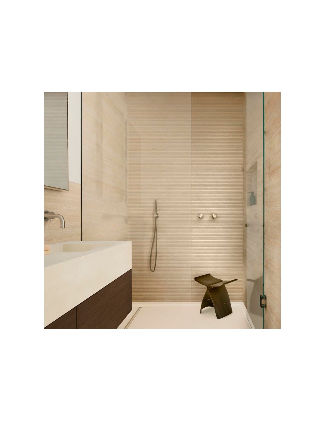 Fabricado en pasta blanca, está destinado exclusivamente al revestimiento de paredes interiores. Su acabado mate resalta el veteado travertino cruzado, y su versatilidad permite combinarlo con otros modelos lisos o estructurados de la colección Fabula, así como con azulejos efecto mármol para lograr composiciones refinadas.