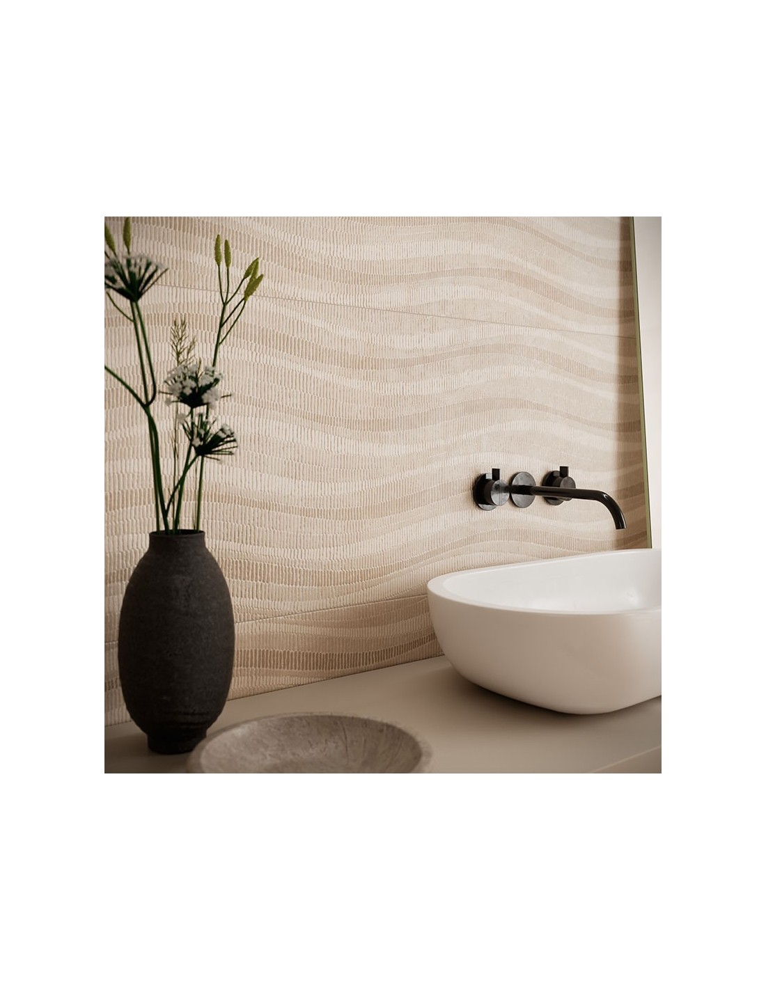 Fabricado en pasta blanca de alta calidad, este azulejo decorativo presenta una textura que simula el movimiento ondulado de la piedra erosionada por el tiempo. Esta característica convierte al modelo Palco Arena en una opción muy apreciada en proyectos de diseño contemporáneo y atemporal, tanto en baños como en zonas de día o espacios comerciales. El gran formato de 45x120 cm potencia la continuidad visual de las superficies, reduciendo juntas y aumentando la sensación de amplitud.