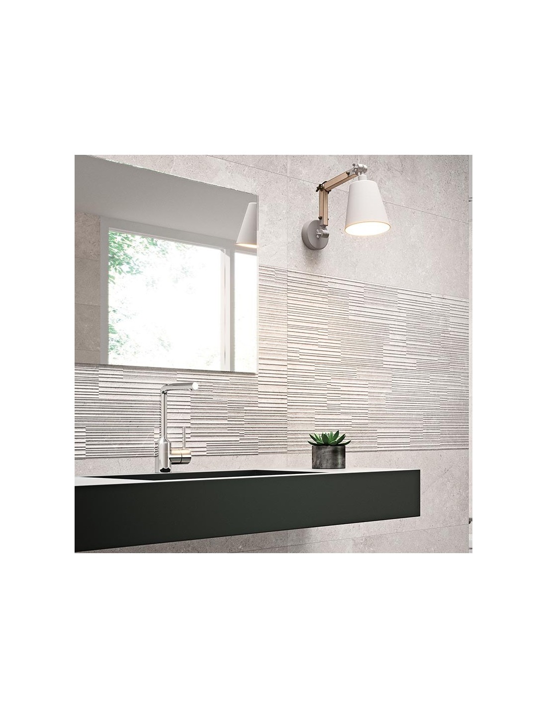 Con su formato de 31.5x100cm, 8mm de espesor y bordes con corte rectificado, permite una colocación precisa con junta mínima de solo 1,5mm, creando un efecto uniforme y contemporáneo. Su diseño lo convierte en la opción ideal para combinar con el modelo base LOIRE Gris, añadiendo textura a baños, cocinas o zonas de estar.