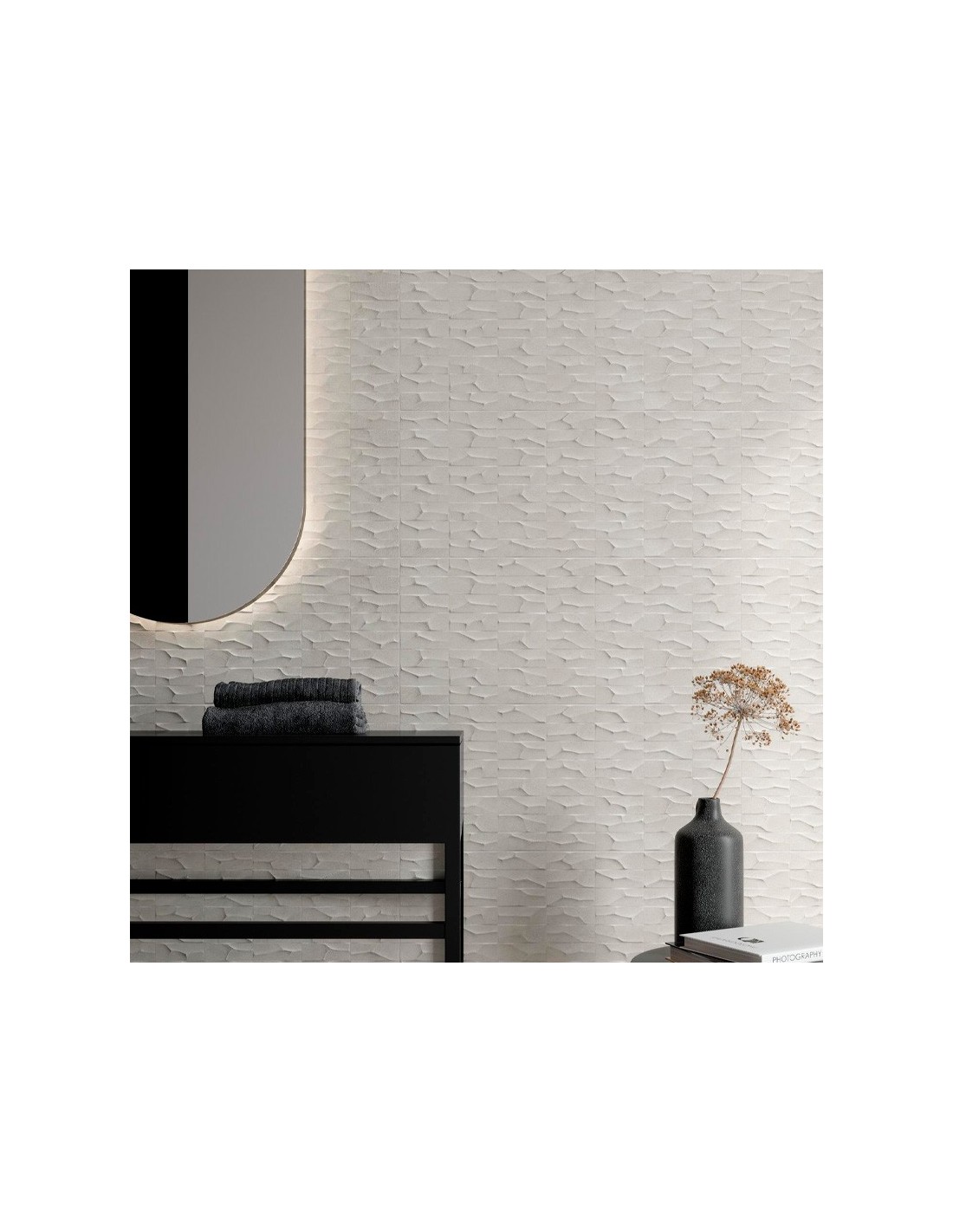 Disponible para compra online el azulejo Plaza 3D Range White de MARAZZI, es una opción cerámica de alta calidad ideal para revestir paredes con un estilo moderno y sobrio. En formato 40x120 cm y grosor fino, este revestimiento de gran formato destaca por su tonalidad blanca, con un relieve sutil, perfecto para ampliar visualmente los espacios y aportar elegancia.