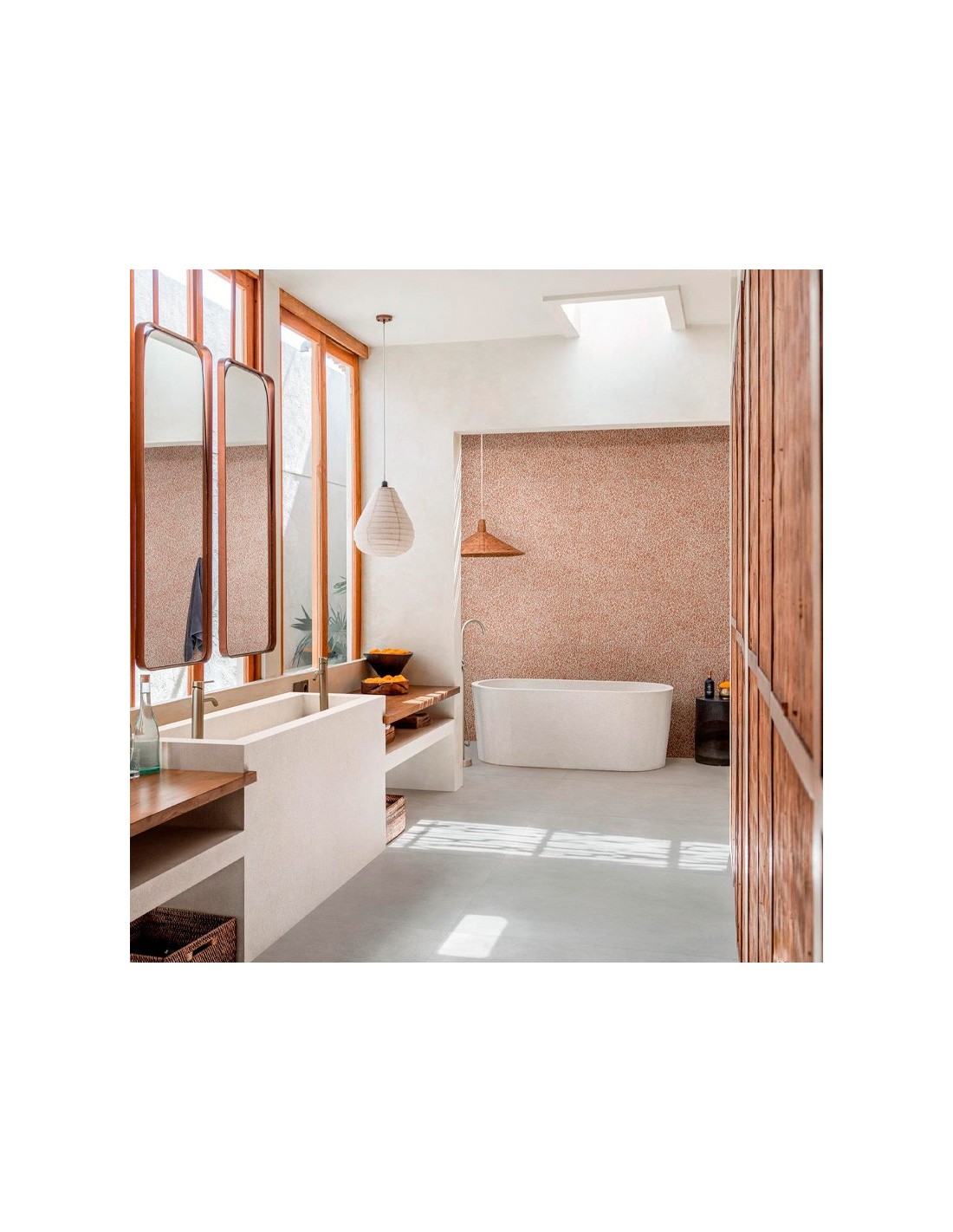 Su tonalidad cotto, un beige claro con matices suaves, aporta calma y elegancia a baños y espacios de bienestar.