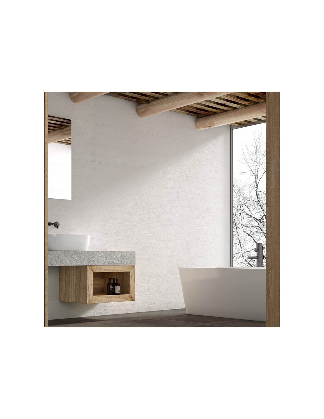 Su tonalidad blanco roto mate y su superficie ligeramente texturizada evocan el aspecto del microcemento, lo que lo convierte en una solución ideal para baños, cocinas o zonas comunes que buscan un estilo minimalista y actual. Es un revestimiento cerámico que combina perfectamente con elementos de madera natural, mobiliario contemporáneo o materiales metálicos.