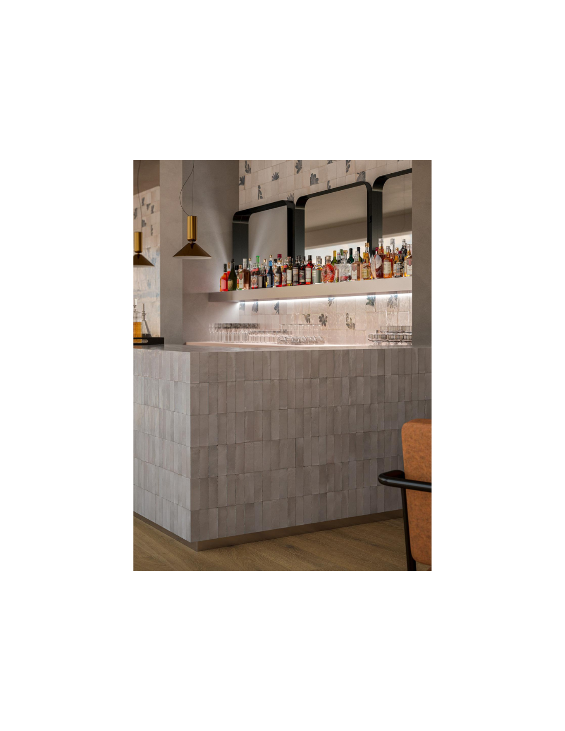 Combina este modelo con madera, mármol o cemento para crear espacios únicos con carácter propio. Gracias a su formato reducido, permite diseños personalizados, desde mosaicos hasta paredes completas.