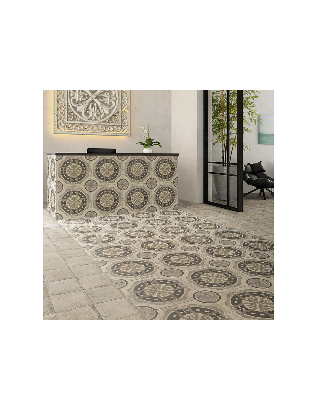 El Porcelánico NORLAND Portland de Mainzu (PT02933) está fabricado con porcelánico de alta resistencia, ideal para suelos y paredes tanto en interiores como en exteriores. Su superficie presenta un acabado mate con una textura suave que reproduce fielmente el aspecto artesanal de los mosaicos hidráulicos. Es una opción perfecta para quienes buscan durabilidad sin renunciar al estilo decorativo más clásico.